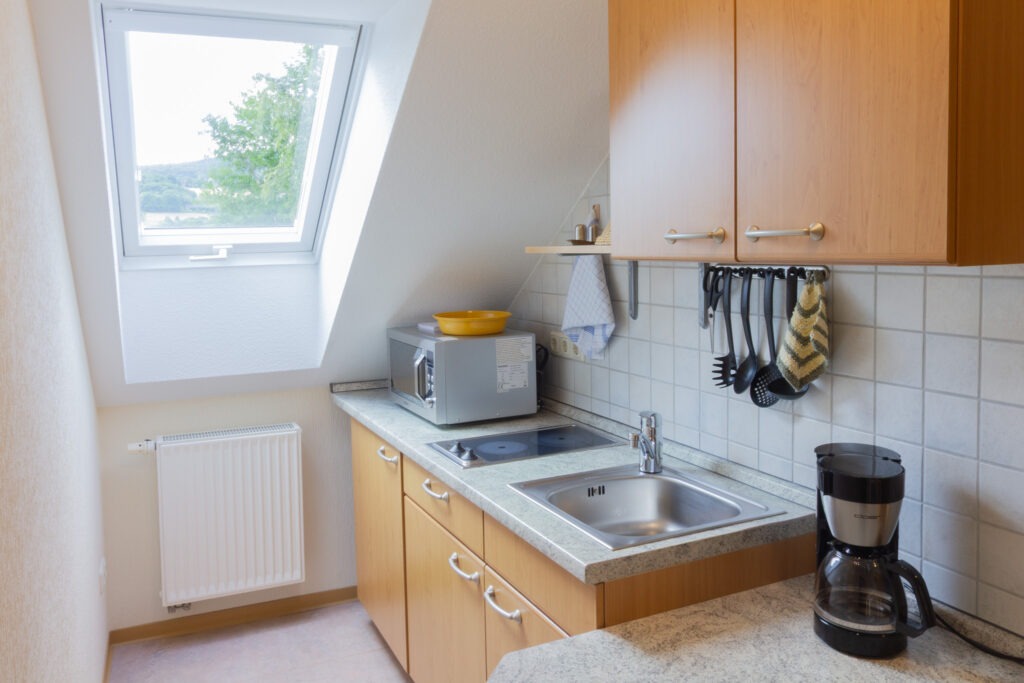 Kochnische mit zwei Herdplatten, Dunstabzugshaube, Kühlschrank, Mikrowelle sowie Kaffee- und Brotschneidemaschine, Toaster, Wasser- und Eierkocher, Esstisch