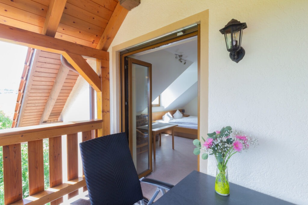 nicht einsehbarer Holzbalkon nach Südosten mit herrlichem Ausblick in die freie Natur, Gartentisch mit bequemen Stühlen