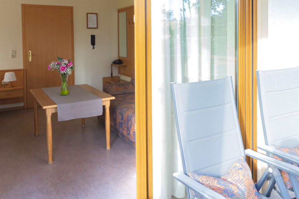 nicht einsehbarer Holzbalkon nach Westen mit herrlichem Ausblick in die freie Natur, Gartentisch mit bequemen Stühlen