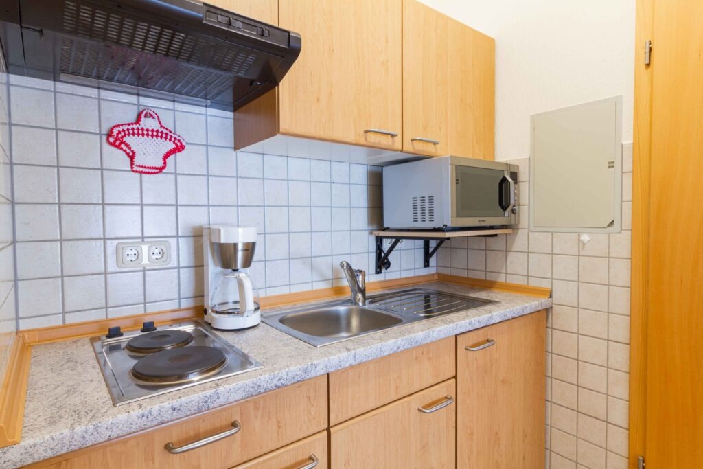 Kochnische mit zwei Herdplatten, Dunstabzugshaube, Kühlschrank, Mikrowelle sowie Kaffee- und Brotschneidemaschine, Toaster, Wasser- und Eierkocher, Esstisch