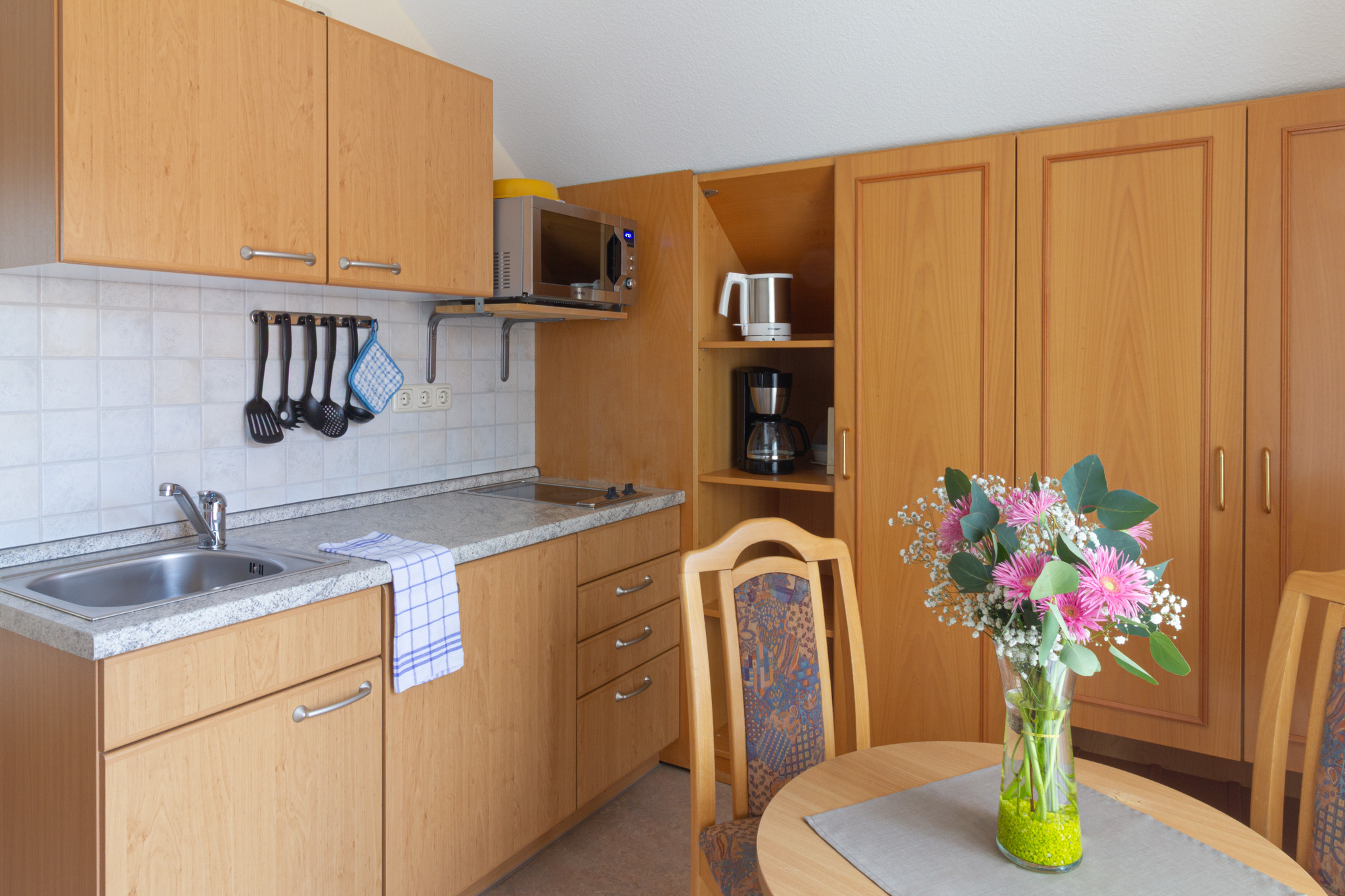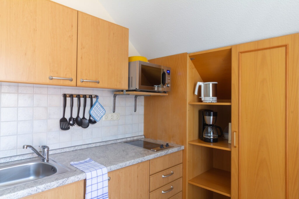 Kochnische mit zwei Herdplatten, Dunstabzugshaube, Kühlschrank, Mikrowelle sowie Kaffee- und Brotschneidemaschine, Toaster, Wasser- und Eierkocher, Esstisch, zwei Sitzmöglichkeiten
