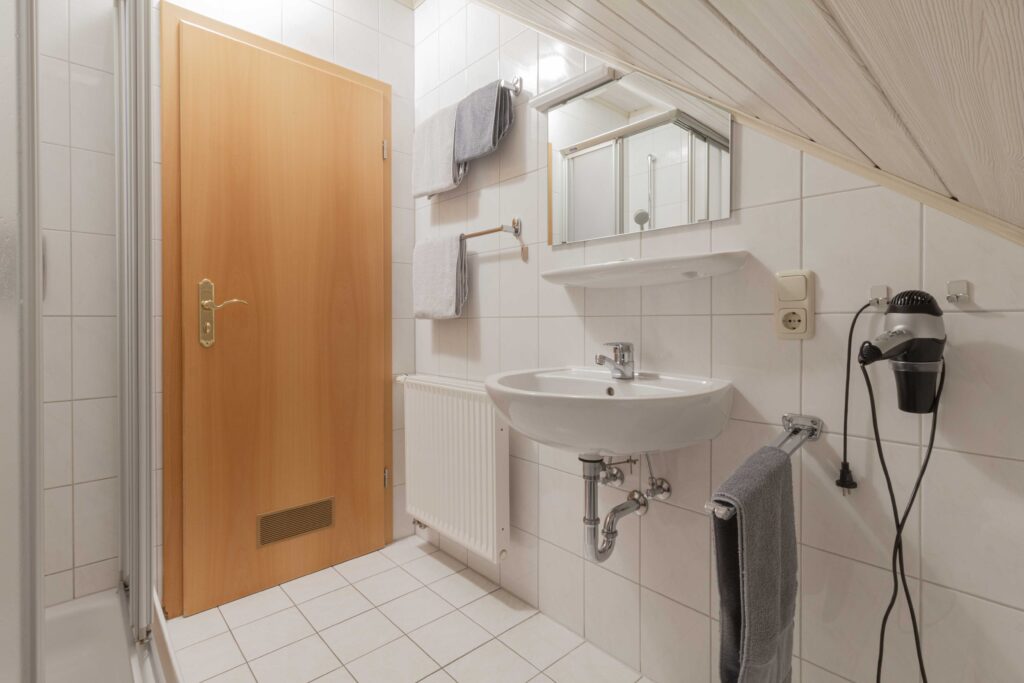 Freundliches Bad mit Dusche, WC, Waschbecken, Spiegelschrank, Haartrockner