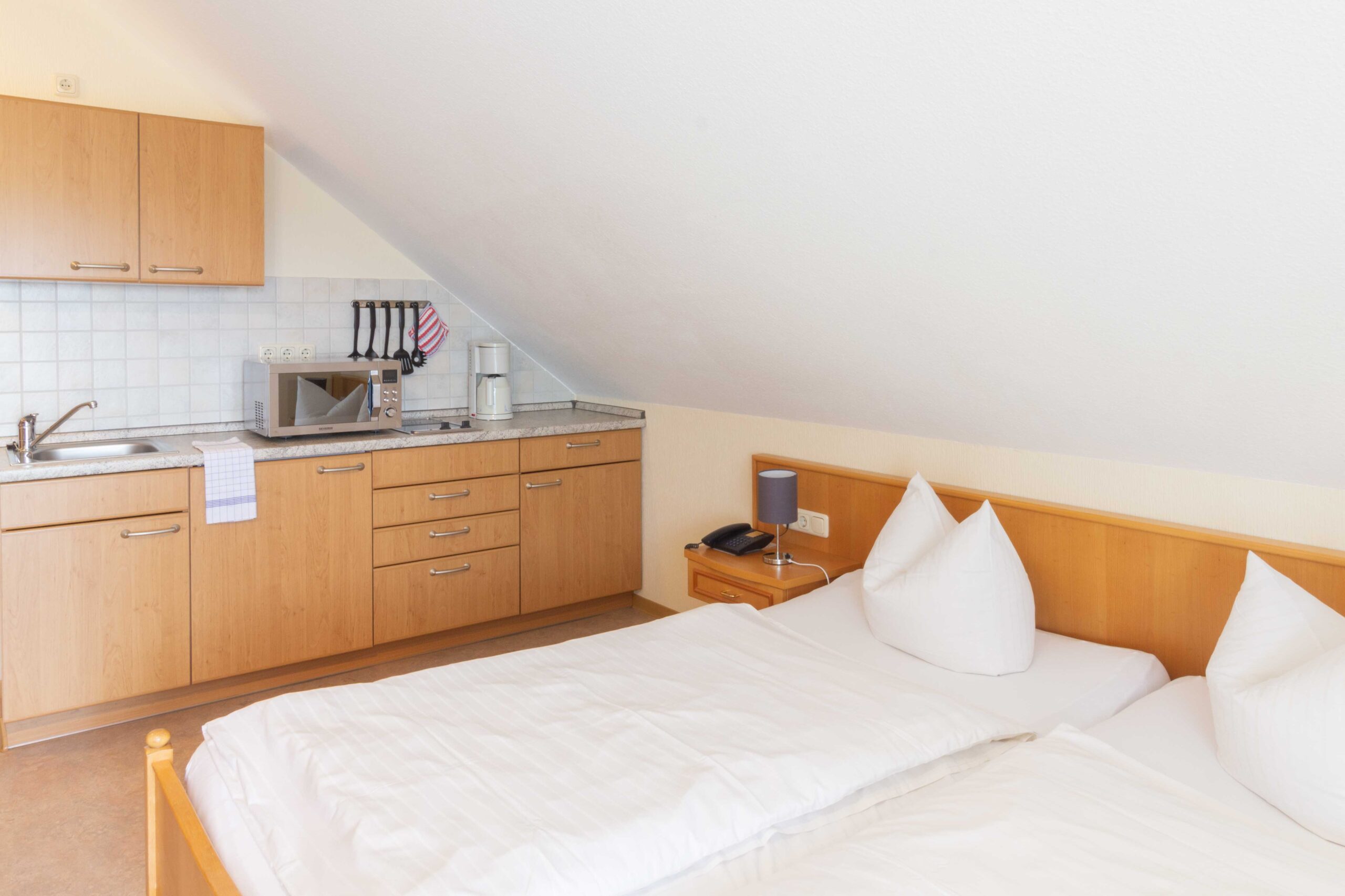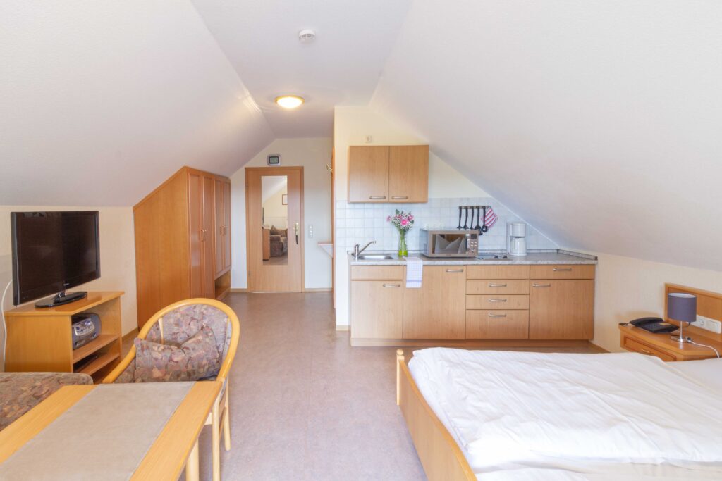 Kochnische mit zwei Herdplatten, Dunstabzugshaube, Kühlschrank, Mikrowelle sowie Kaffee- und Brotschneidemaschine, Toaster, Wasser- und Eierkocher, Esstisch