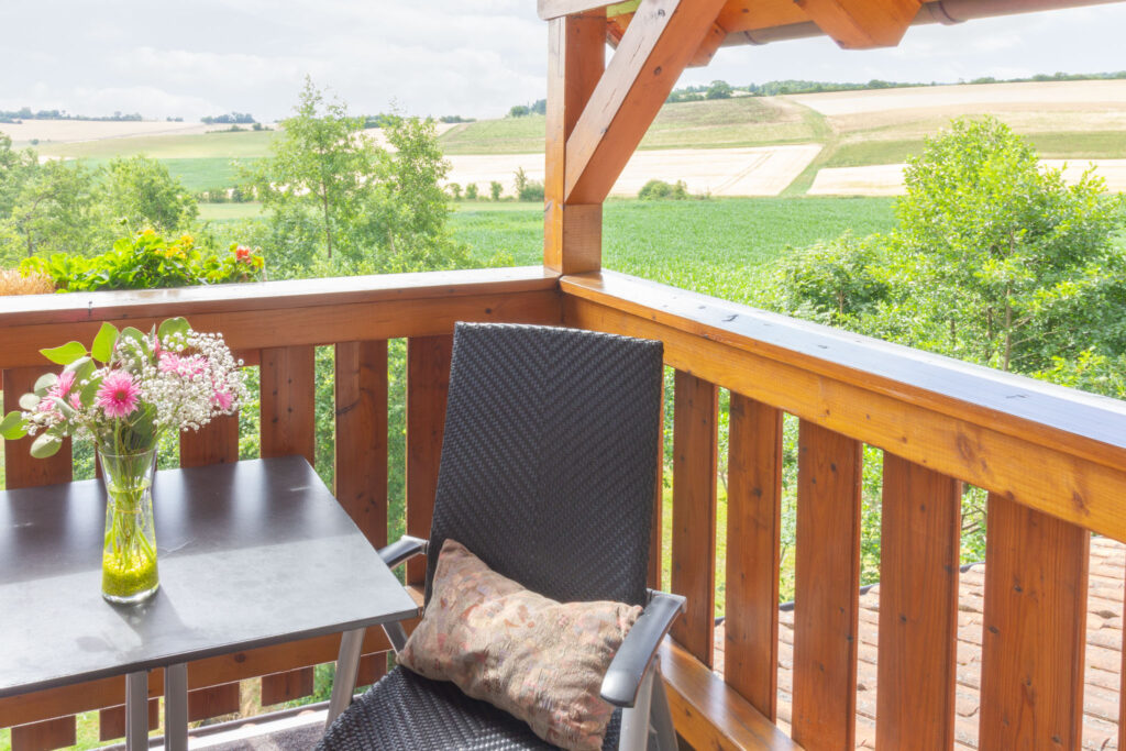nicht einsehbarer Holzbalkon nach Süden mit herrlichem Ausblick in die freie Natur, Gartentisch mit bequemen Stühlen