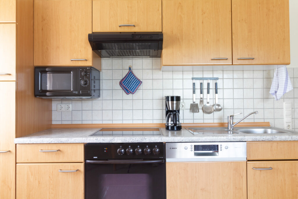 geräumige Wohnküche mit Küchenzeile inklusive Ceranfeld, Backofen und Dunstabzugshaube sowie Spülmaschine, Kühlgefrierkombination, Mikrowelle, Kaffee‐ und Brotschneidemaschine, Toaster, Wasser‐ und Eierkocher, ausziehbare Esstisch mit gemütlicher Eckbank und Einzelstühlen