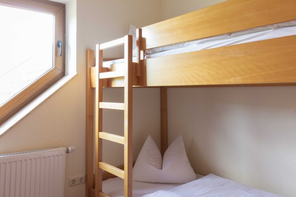 Wohnzimmer mit Ausziehcouch für zwei Personen, Tisch, zwei Sessel, Flatscreen, Doppelbett und Stockbett mit komfortablen Matratzen, Safe, Radiowecker