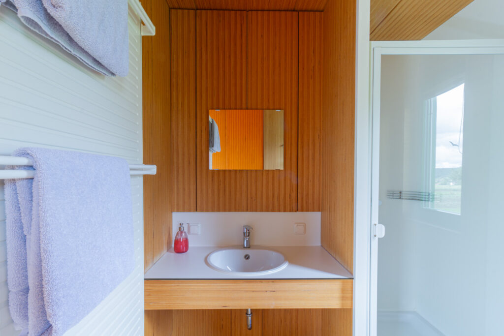 Freundliches Bad mit Dusche, Waschbecken, Spiegelschrank, Haartrockner, WC separat